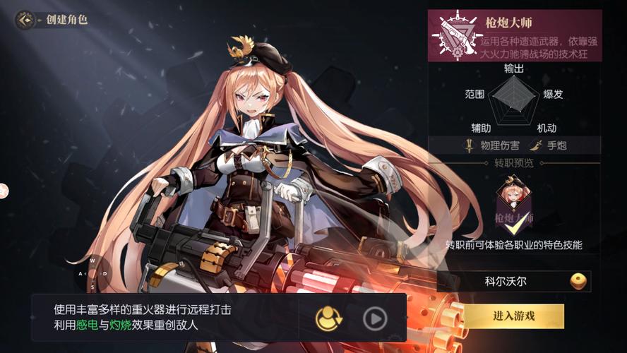 枪炮大师:物理远程输出职业,擅长手炮高输出远程群体攻击。其技能有“灼烧”和“感电”效果,可通过装备提升这两种伤害特性以及最终伤害和技能伤害。不过,该职业生存能力弱且位移能力有限。