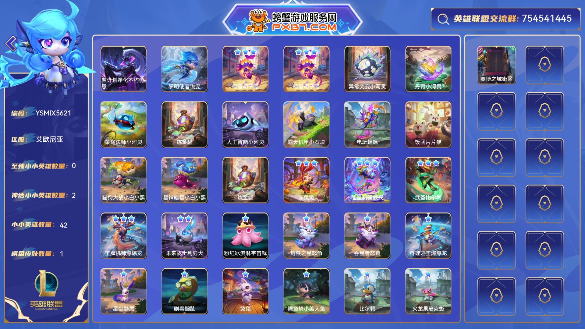 【传说小小英雄】:3星利刃柴犬,3星明昼利刃犬,3星海克斯科技石像仔,3星胖嗡嗡龙胖胖龙,3星吞星者风神鼠,3星暗影节拍魔力玛,2星舞龙少女奥希雅,2星社交名流小妖,2星博士小志,2星暗影面具幽灵,2星贝斯女皇琦琦,2星瓷娃娃铃角,1星小红瓶小河灵,1星潜水员小河灵,1星花瓣舞者发条鸟,1星小蜜蜂啵啵龙,1星蜂魔嗡嗡虫,1星胜利嗡嗡虫,1星系星魔须宇宙鱿,1星料理之王宇宙鱿,1星至高神皇小志,1星幸运花灯小雅,1星小天角兽,1星绅士小鲨鱼,1星铸星龙王敖兴,1星明昼斩月狼,1星吞星魔口星星鲲,1星皇家锦鲤星星鲲,1星呆呆比尔鸭,1星执事爆爆龙,1星棘背符灵,1星鸦领主羽饰骑士,1星腥红之月铃角,1星胜利铃角,1星凯旋铃角,1星永恒静尾,1星破败军团风神鼠,1星甜筒魄罗,1星电玩黏黏,1星DJ黏黏,异常突变小河灵,饺子小河灵,双城之战小河灵,奇葩小河灵,龙蛋小河灵,温泉蛋小河灵,超级小河灵,超级大坏蛋小河灵,超级粉丝小河灵,丹青小河灵,究极粉丝小河灵,坩埚小河灵,菜鸟法师小河灵,胜利发条鸟,凯旋发条鸟,胜利喵卫,胜利小妖,胜利石像仔,胜利魔力玛,胜利皮克蜥,炼金罐,人工智能小河灵,炼金罐,赛博之城小河灵;